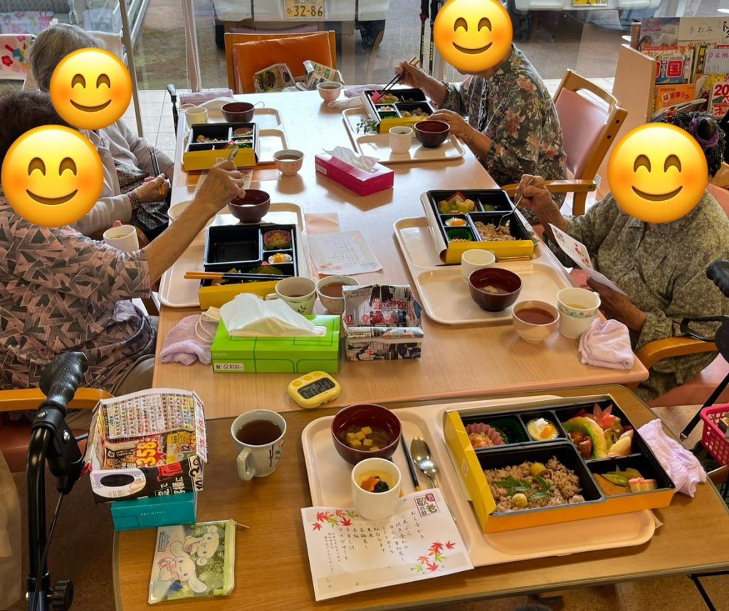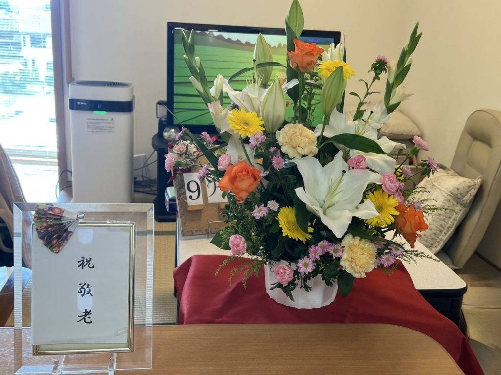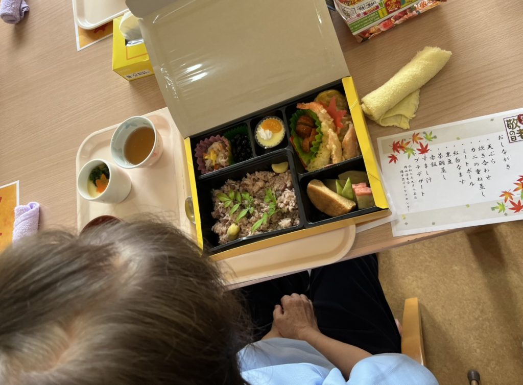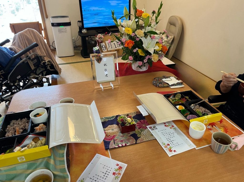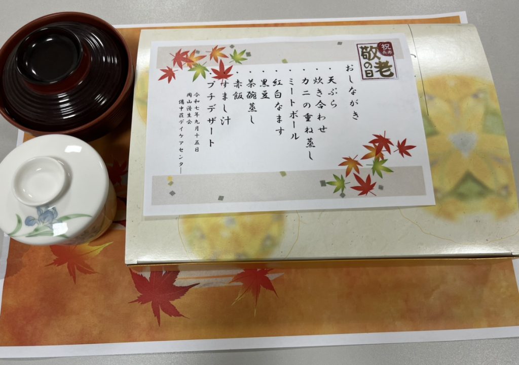 敬老の日 2025年10月06日 | 備中荘 心を込めたお弁当です。 蓋を開けた時に感動していただきたくて、味はもちろん見た目にもこだわって作っています。 加茂地区愛育委員のみなさまによるボランティア 朗読とマツケンサンバ♪みなさま熱心に聞いておられました。 ボランティアのみなさまありがとうございました。 デイケアのご利用者様とクレープづくり 丸く焼くのが皆さんお上手!!果物のカットもさすがの包丁さばきです。 トッピングをご自身で、お好きなように☆ おいしく召し上がられました。 敬老の日に気持ちを込めて、各ユニットをお花で飾りました 敬老の日についてはインスタにも載せています。 ぜひご覧ください。 シェアする