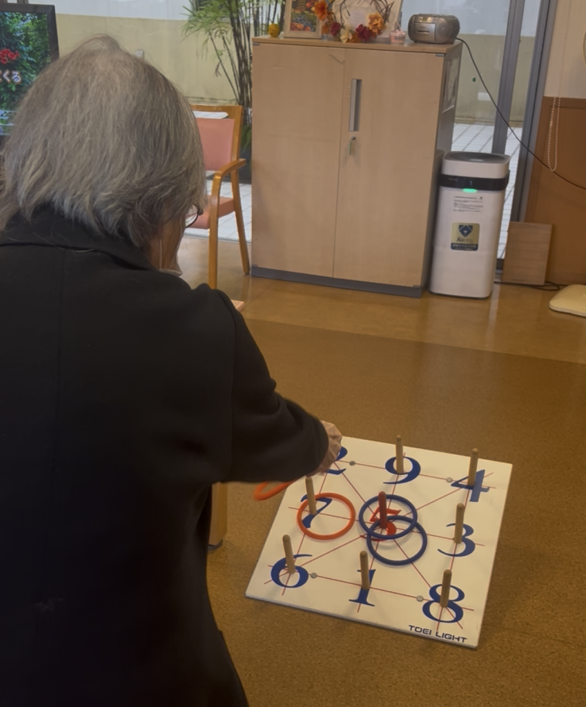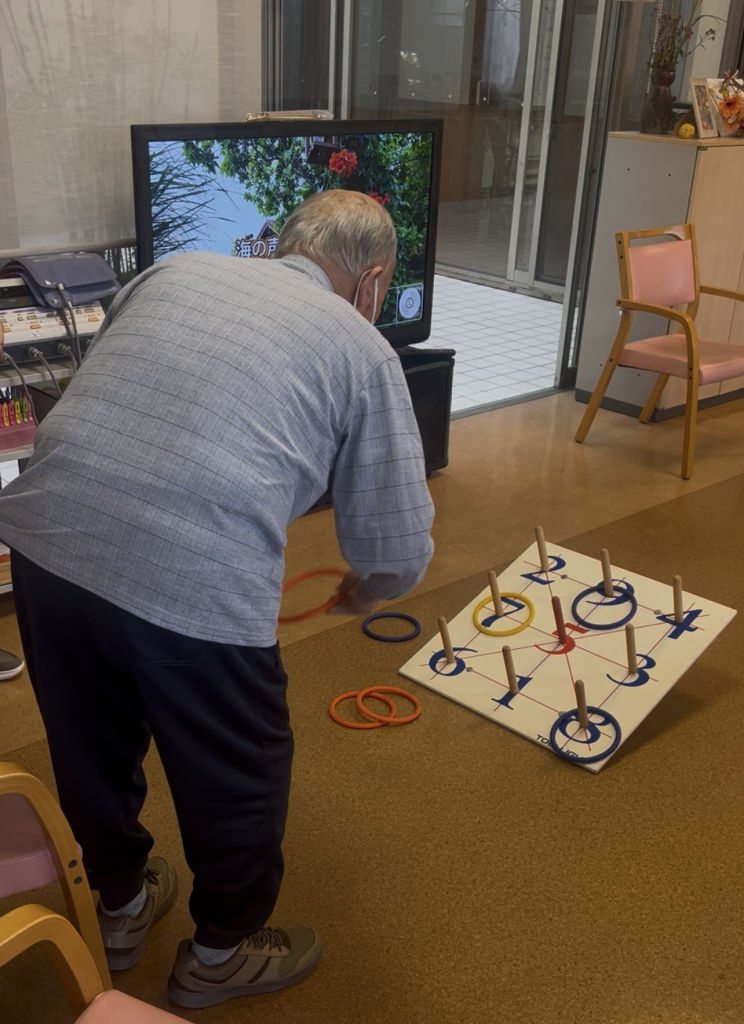 輪投げは、送りの時間が始まったころ少人数になってからスタート。残りの時間を楽しくみんなで共有します。