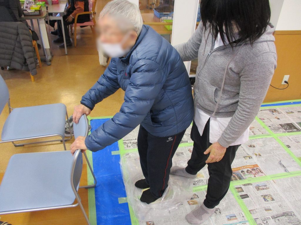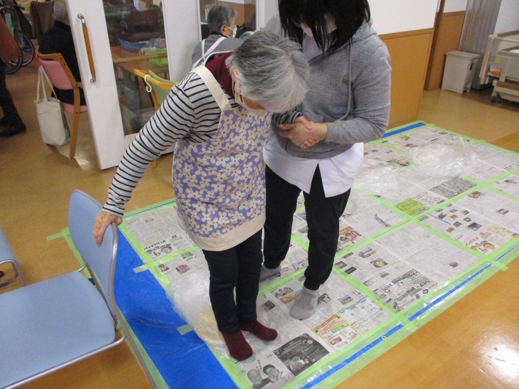 こねたうどんの生地を、踏んでコシを出していきます。うどん生地は、ビニールで包んでいるのですべりやすく、踏ん張ったり踏み込んだり、バランスをとったり、とてもいいリハビリになりました。