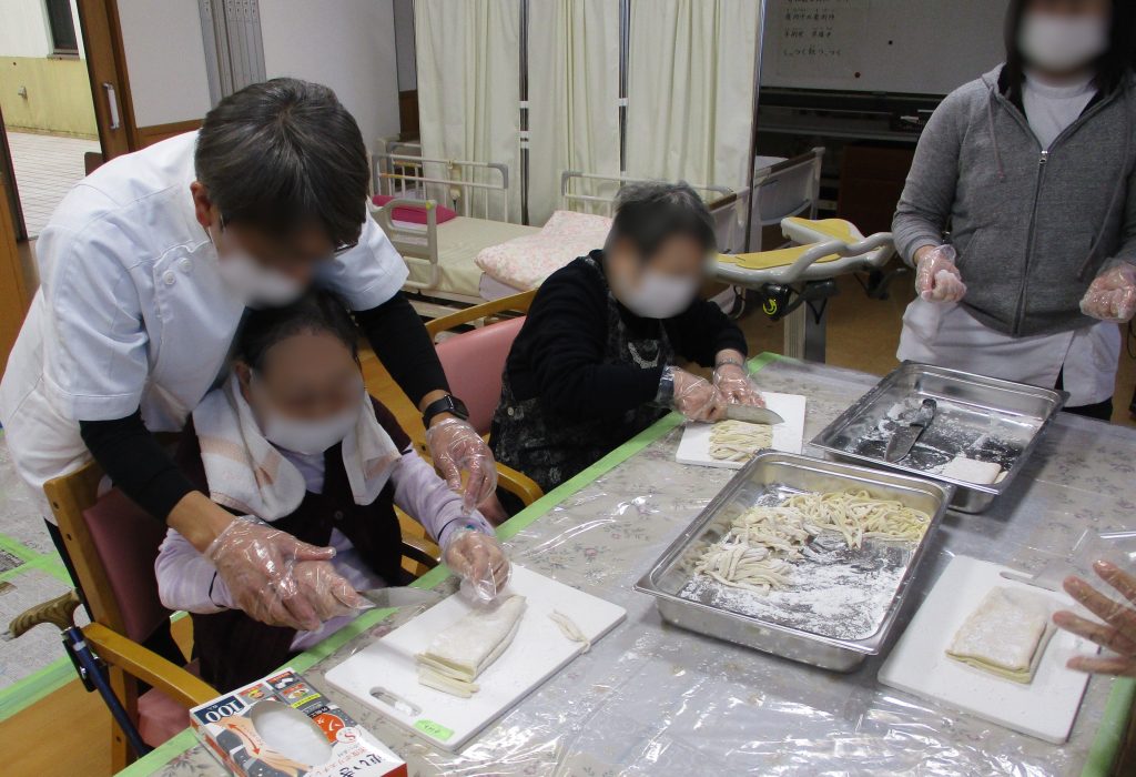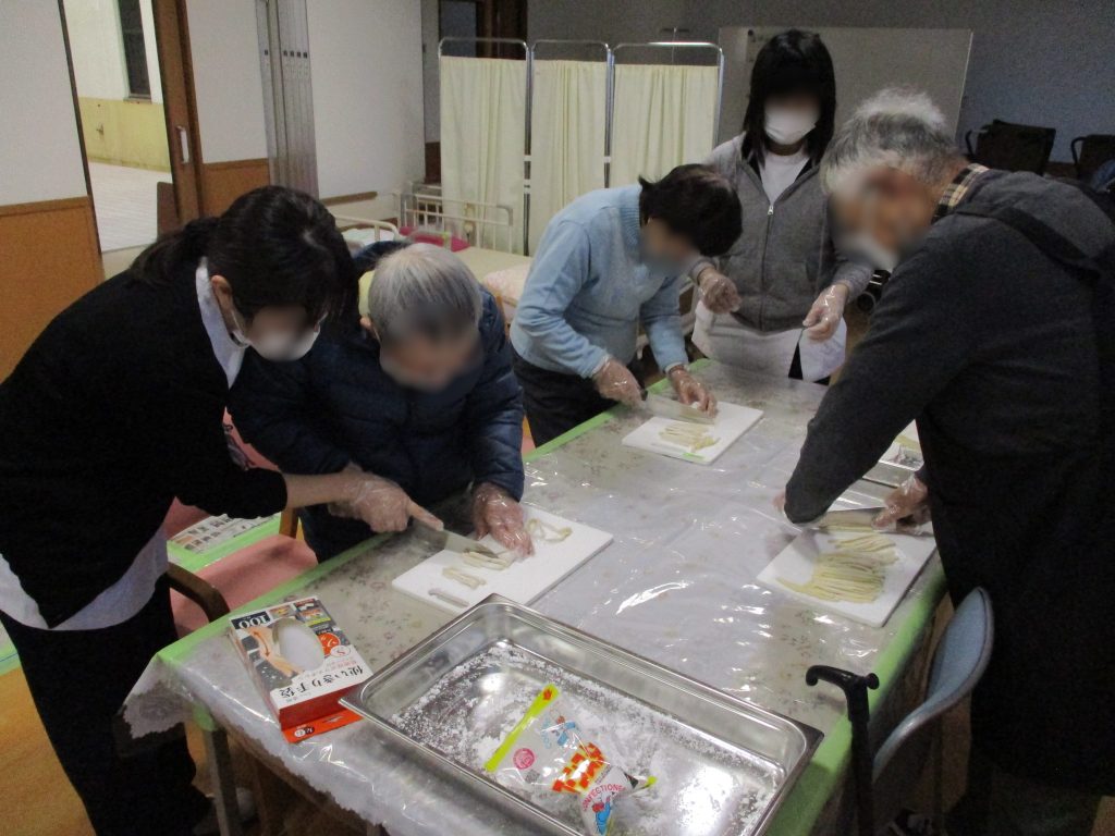 昨年の年末もデイケアで、利用者様とともに手作りうどんを作りました。うどんに添える天ぷらの材料の仕込みからスタートです。